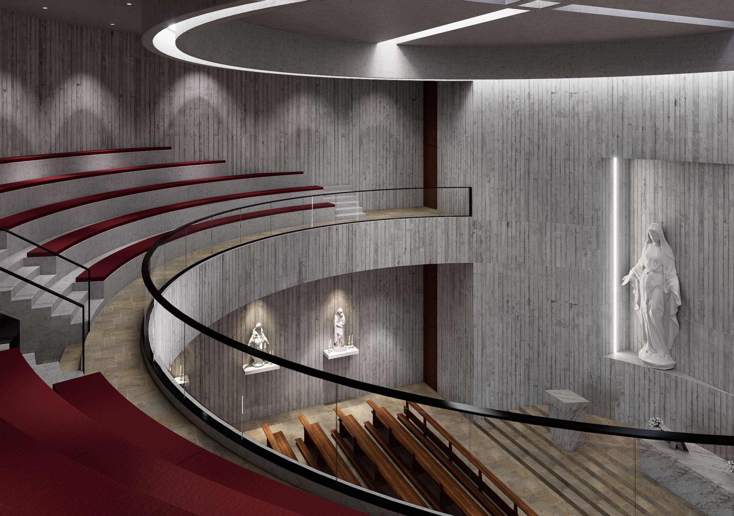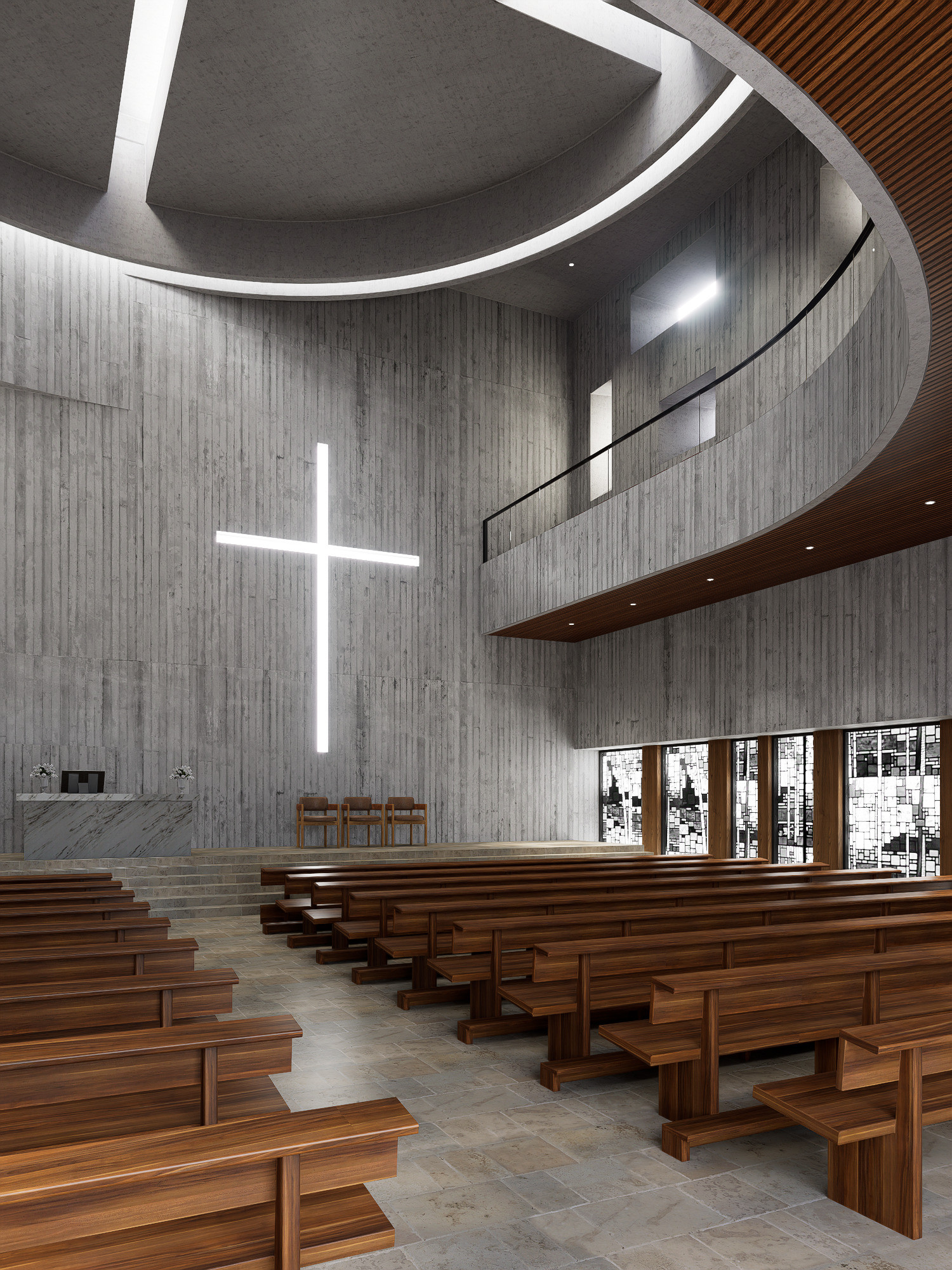 El diseño parte de una idea central: la arquitectura como mediadora entre la ciudad y la fe.