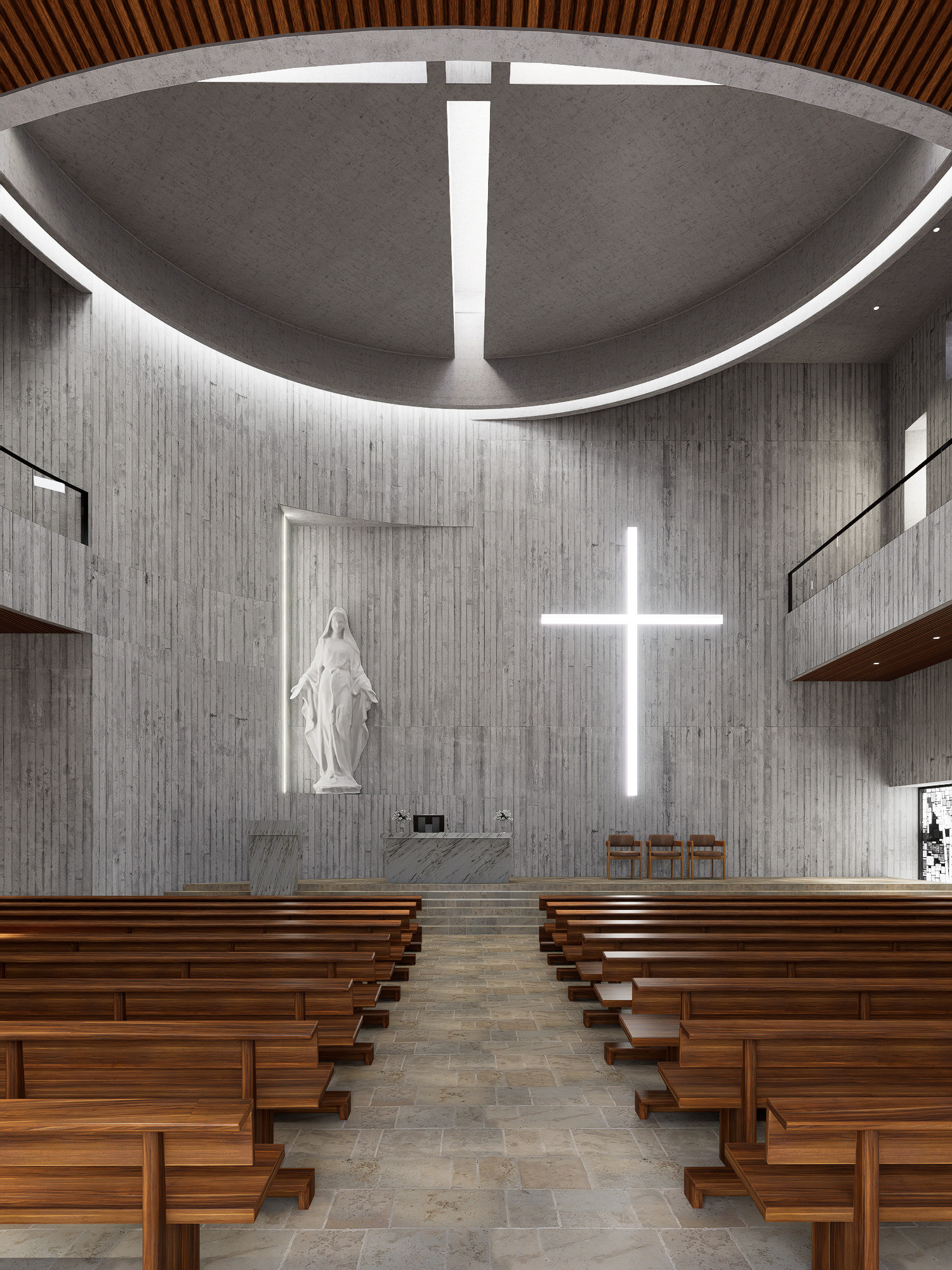 La cruz luminosa que preside el altar actúa como eje visual y espiritual, reforzando la atmósfera de contemplación y solemnidad. El uso del concreto visto aporta permanencia y silencio material, permitiendo que el espacio dialogue con el rito sin imponerse.