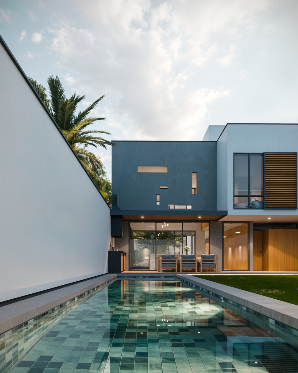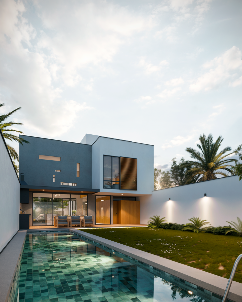 Este análisis reveló algo clave: el proyecto debía abrirse hacia el interior del lote, proteger su fachada y abrazar la luz con moderación pero sin perder la sensación de libertad que solo un patio amplio y una piscina bien ubicada podían brindar.