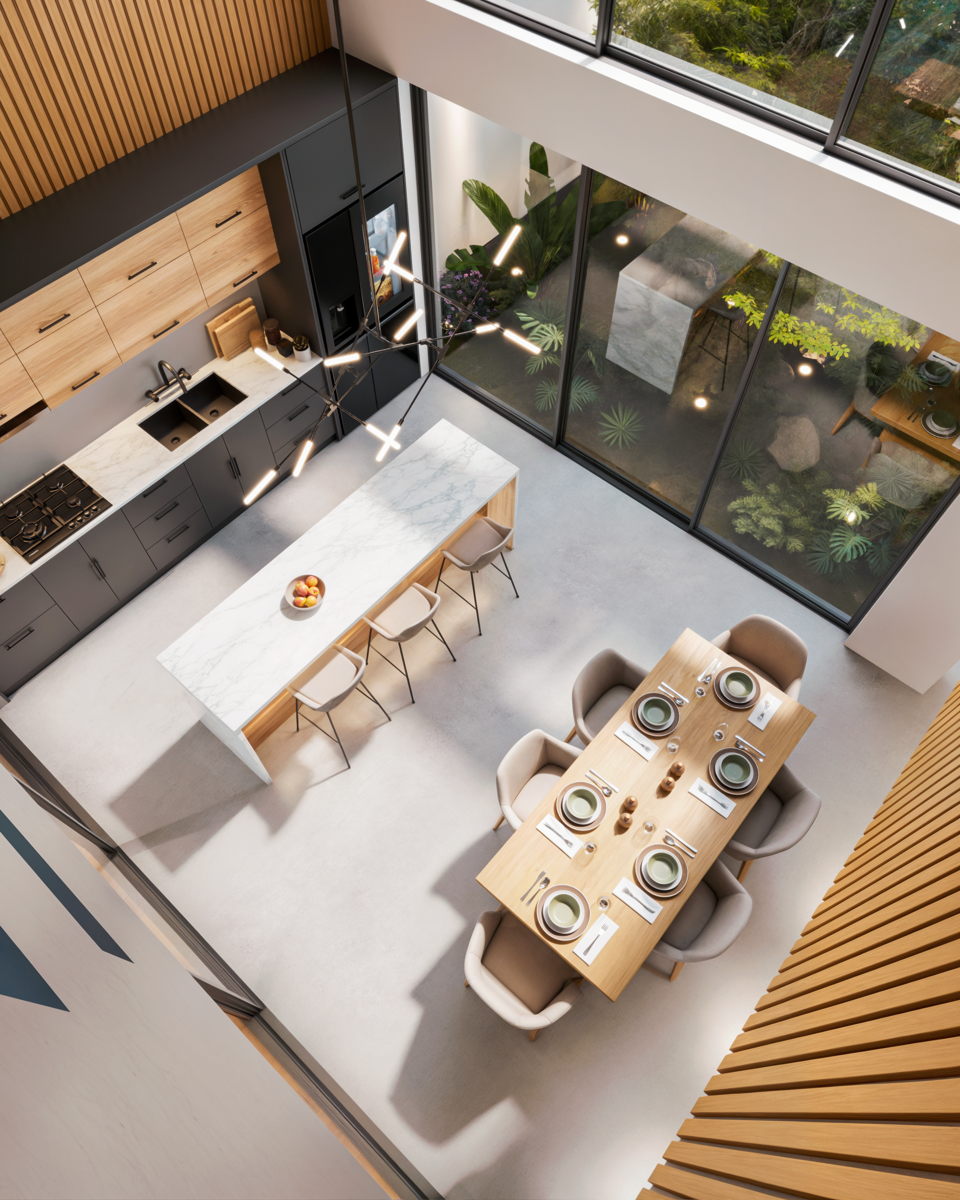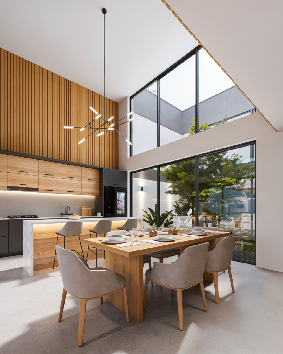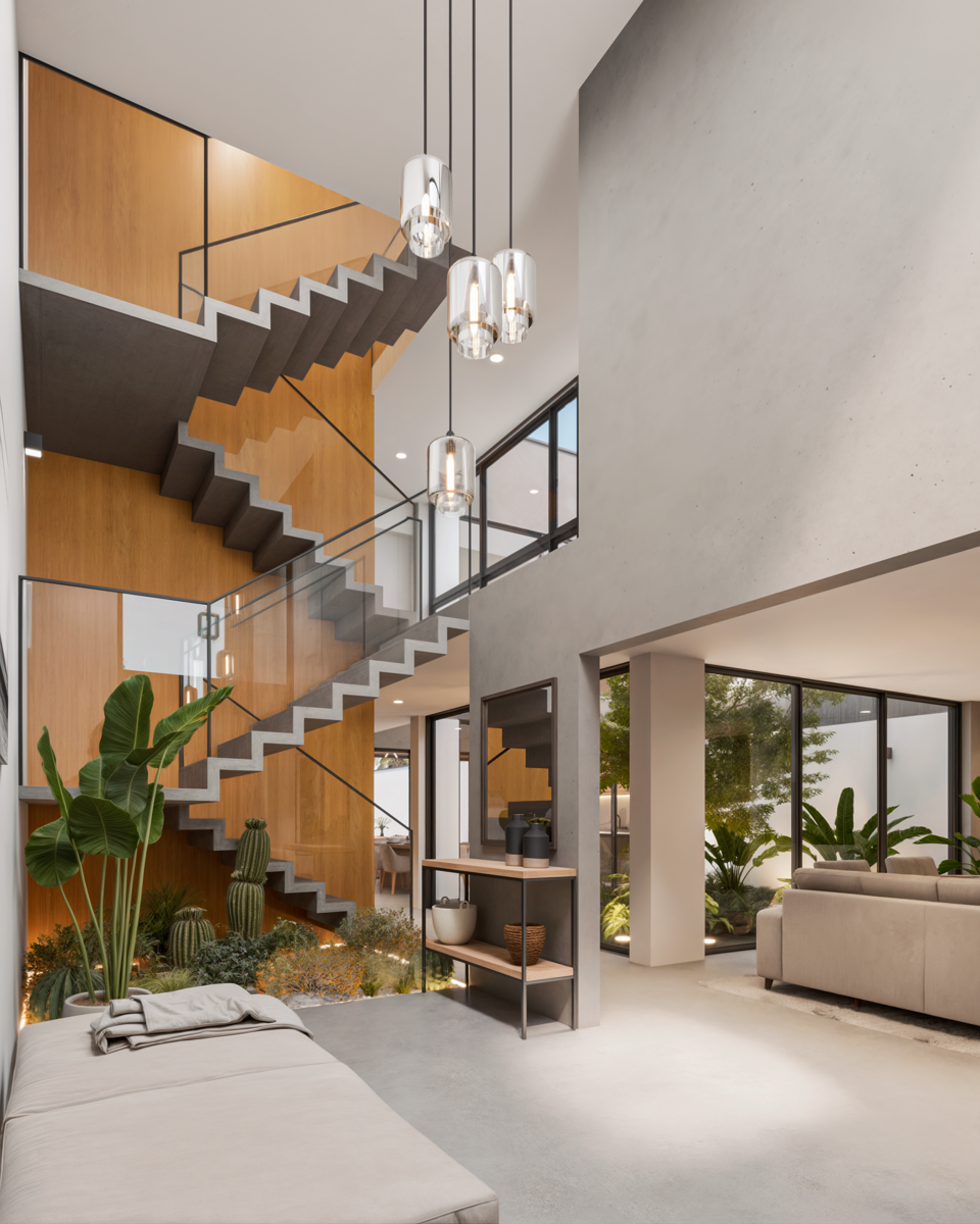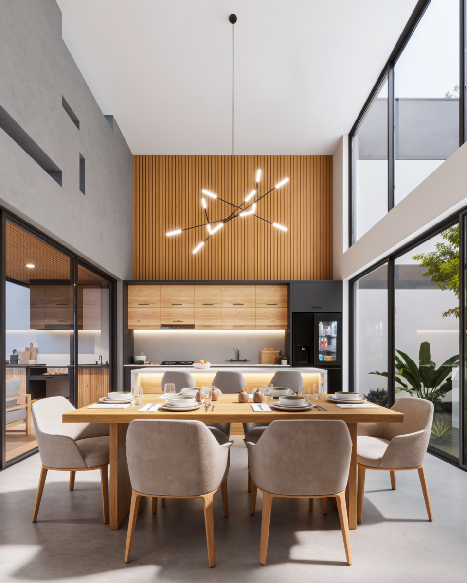 La sala, el comedor y la cocina abierta se integran como un solo espacio que se expande hacia la terraza y la piscina. Una gran mampara de vidrio permite que la casa respire; el patio interior con un árbol central es un elemento simbólico: sombra, frescura y un gesto de vida en medio del verano.