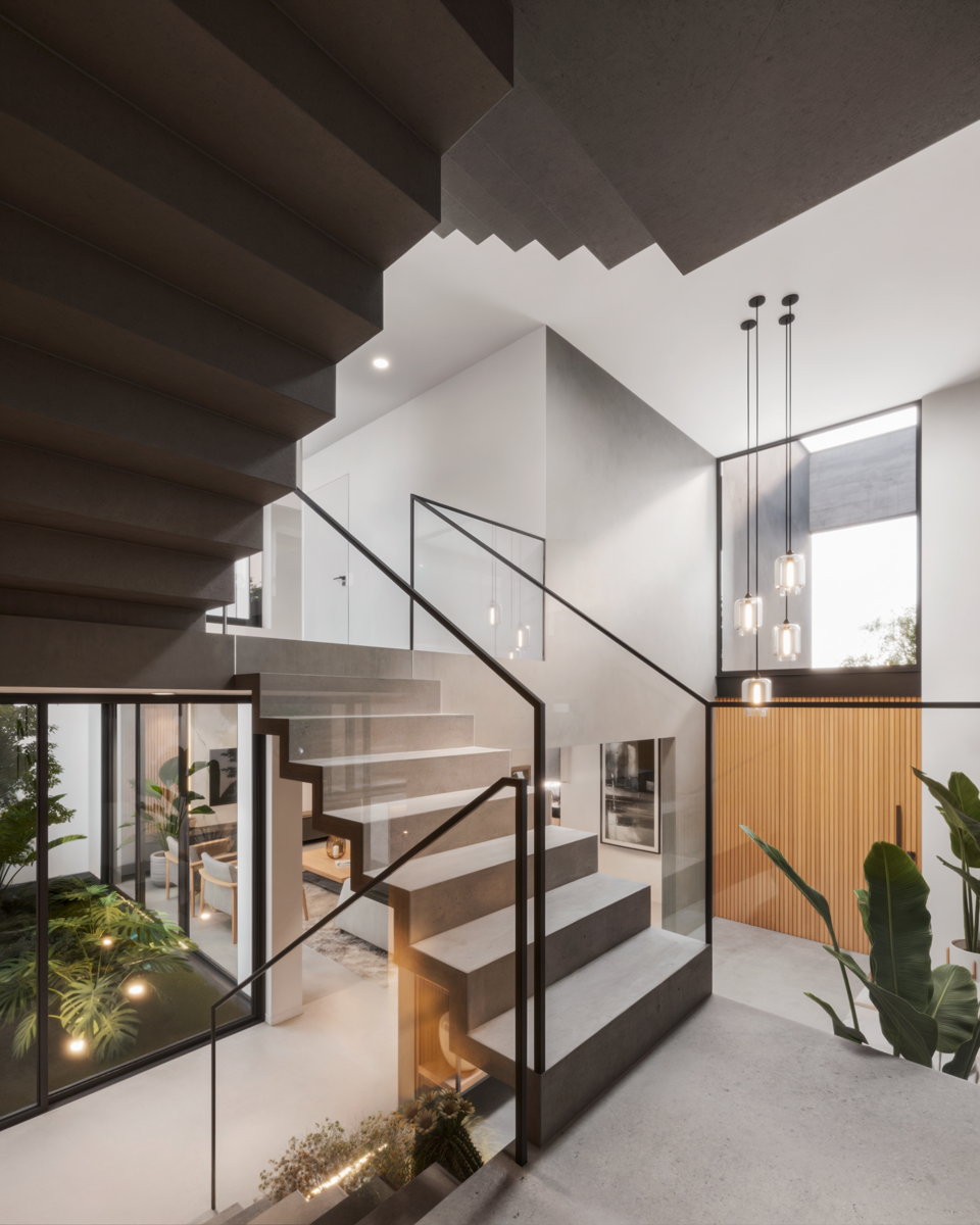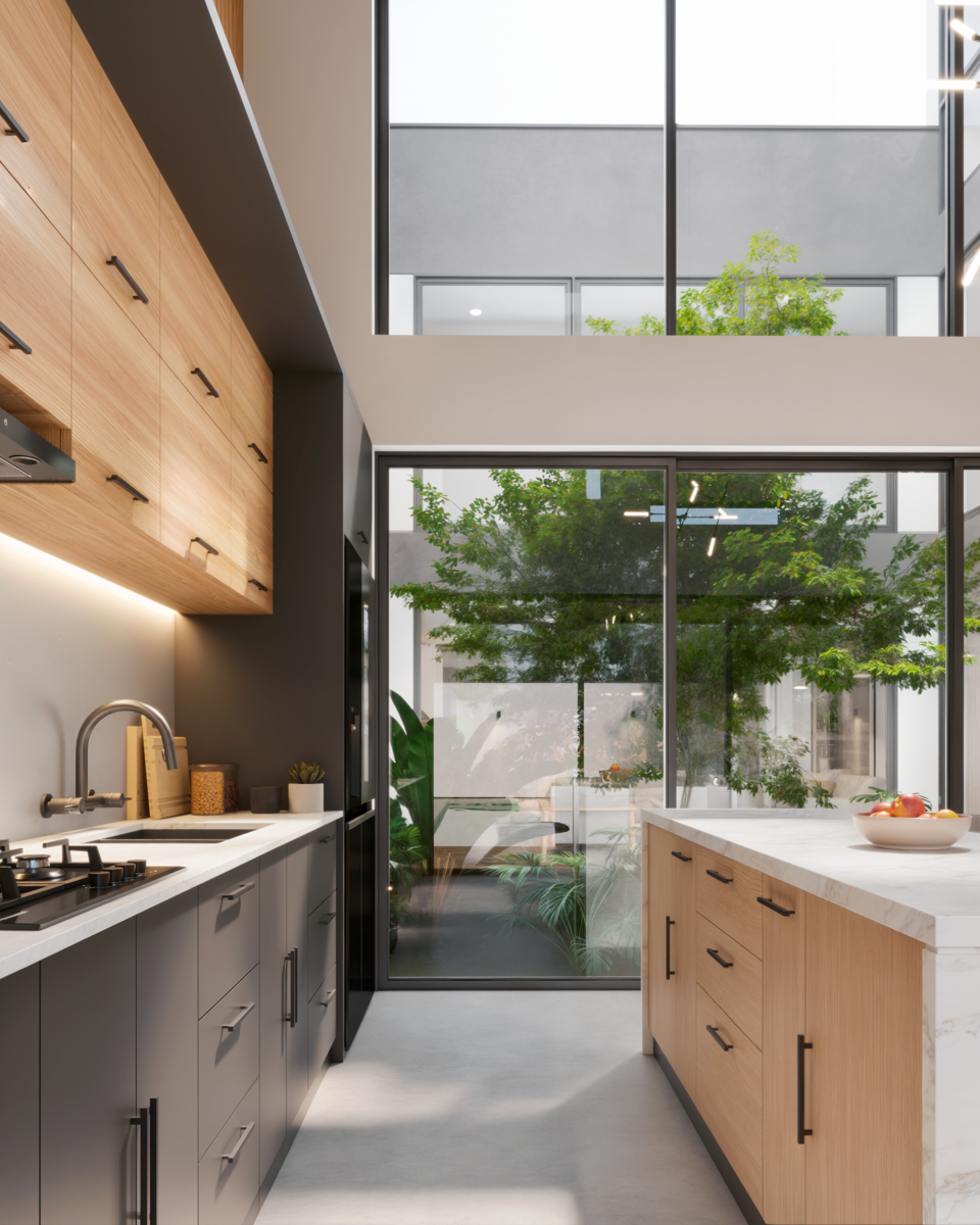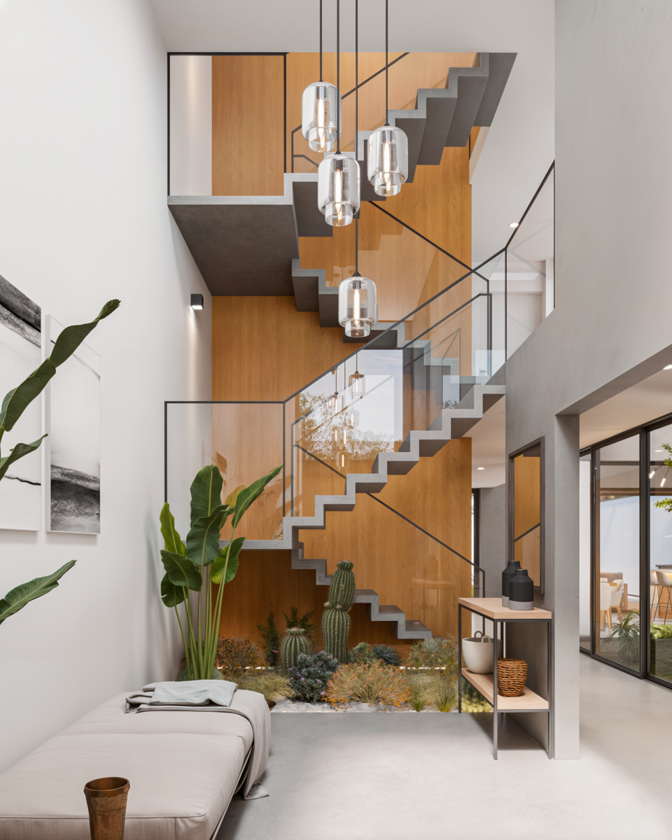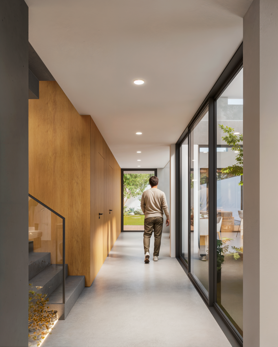 La sala, el comedor y la cocina abierta se integran como un solo espacio que se expande hacia la terraza y la piscina. Una gran mampara de vidrio permite que la casa respire; el patio interior con un árbol central es un elemento simbólico: sombra, frescura y un gesto de vida en medio del verano.