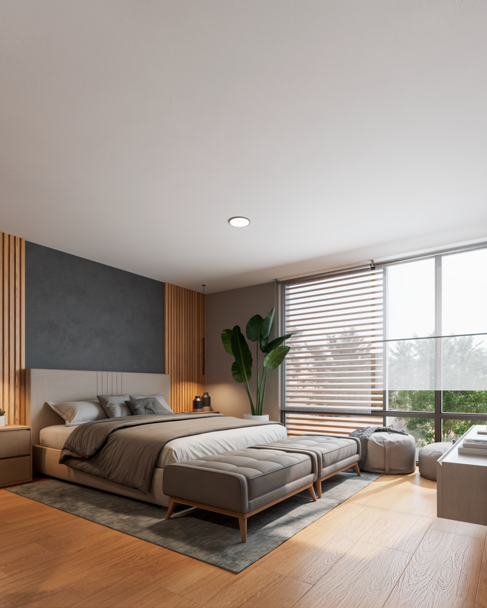Tres dormitorios con baño propio y walk-in closet forman un refugio íntimo. La estructura, cuidadosamente resuelta en los cortes, garantiza proporciones generosas y ventilación.