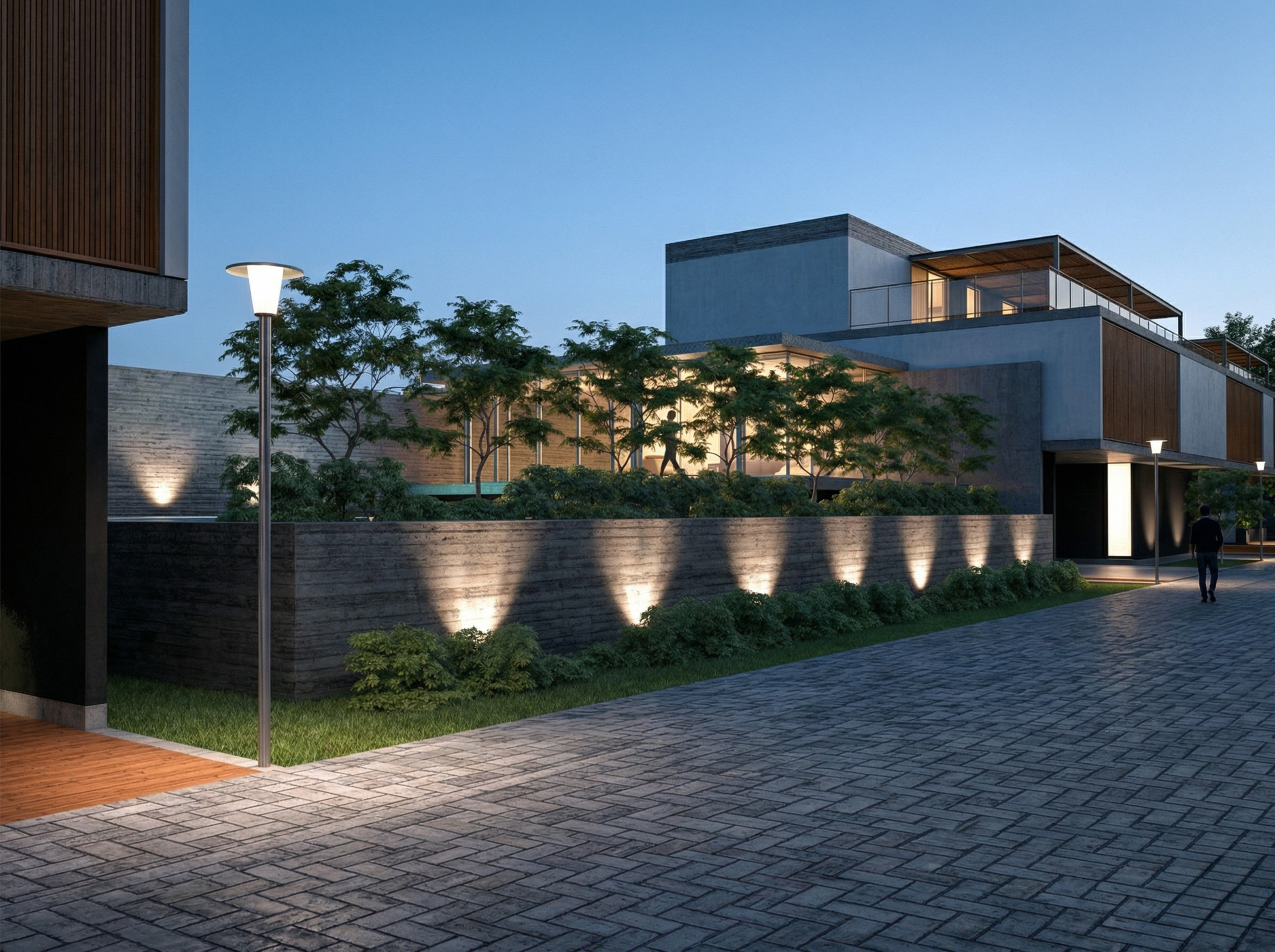 El proyecto plantea una composición volumétrica limpia y horizontal, donde la arquitectura se integra mediante el uso de materiales nobles como concreto expuesto, madera y vidrio.