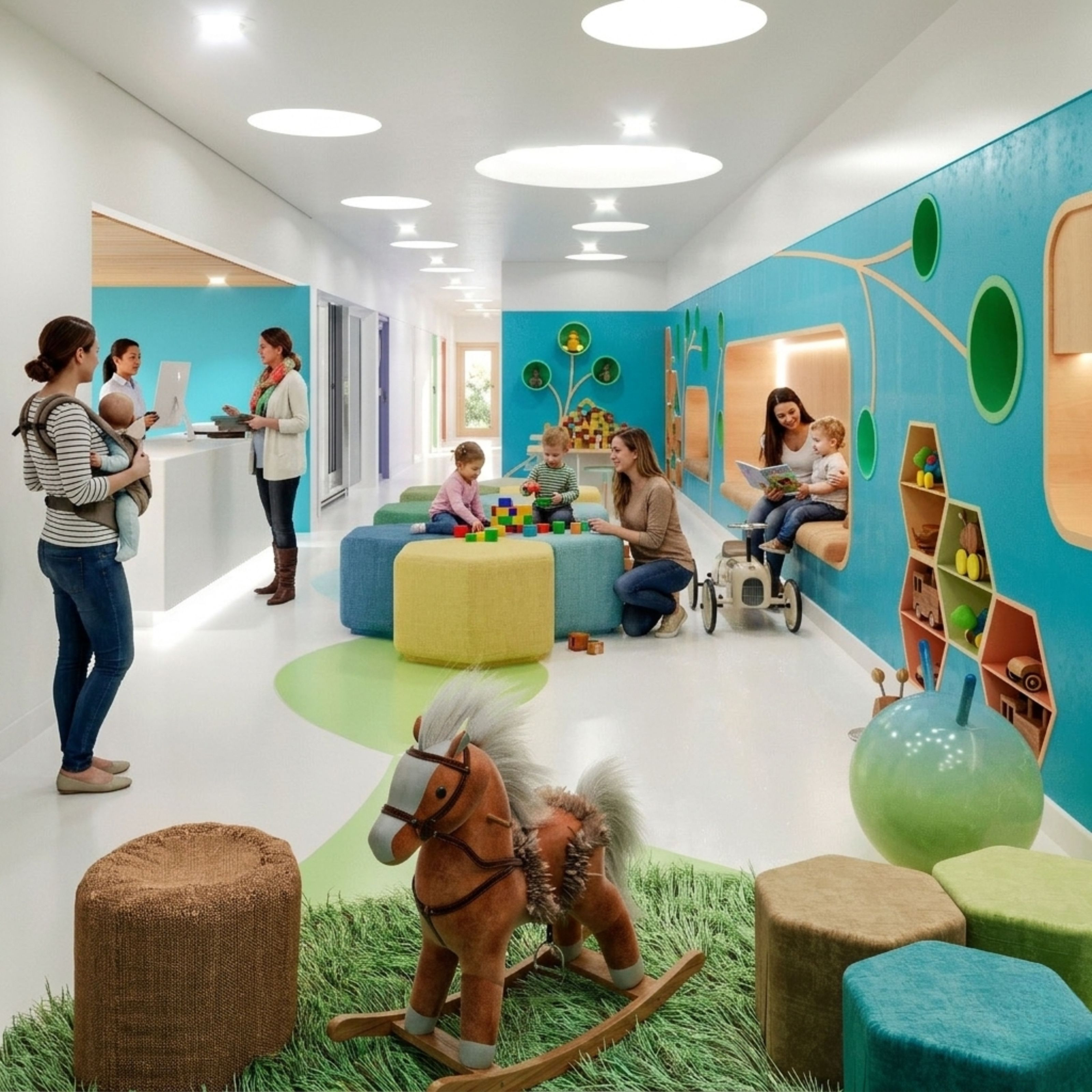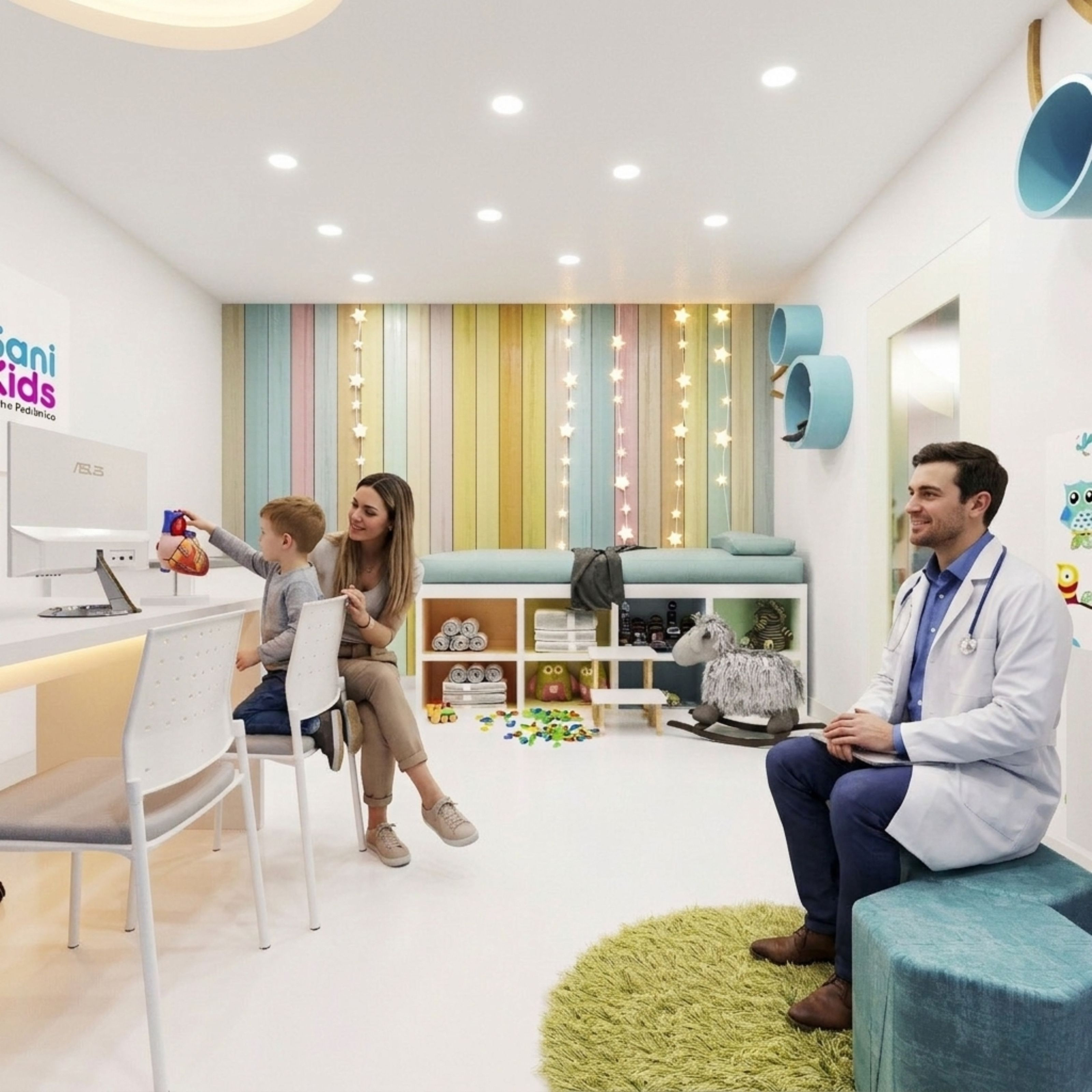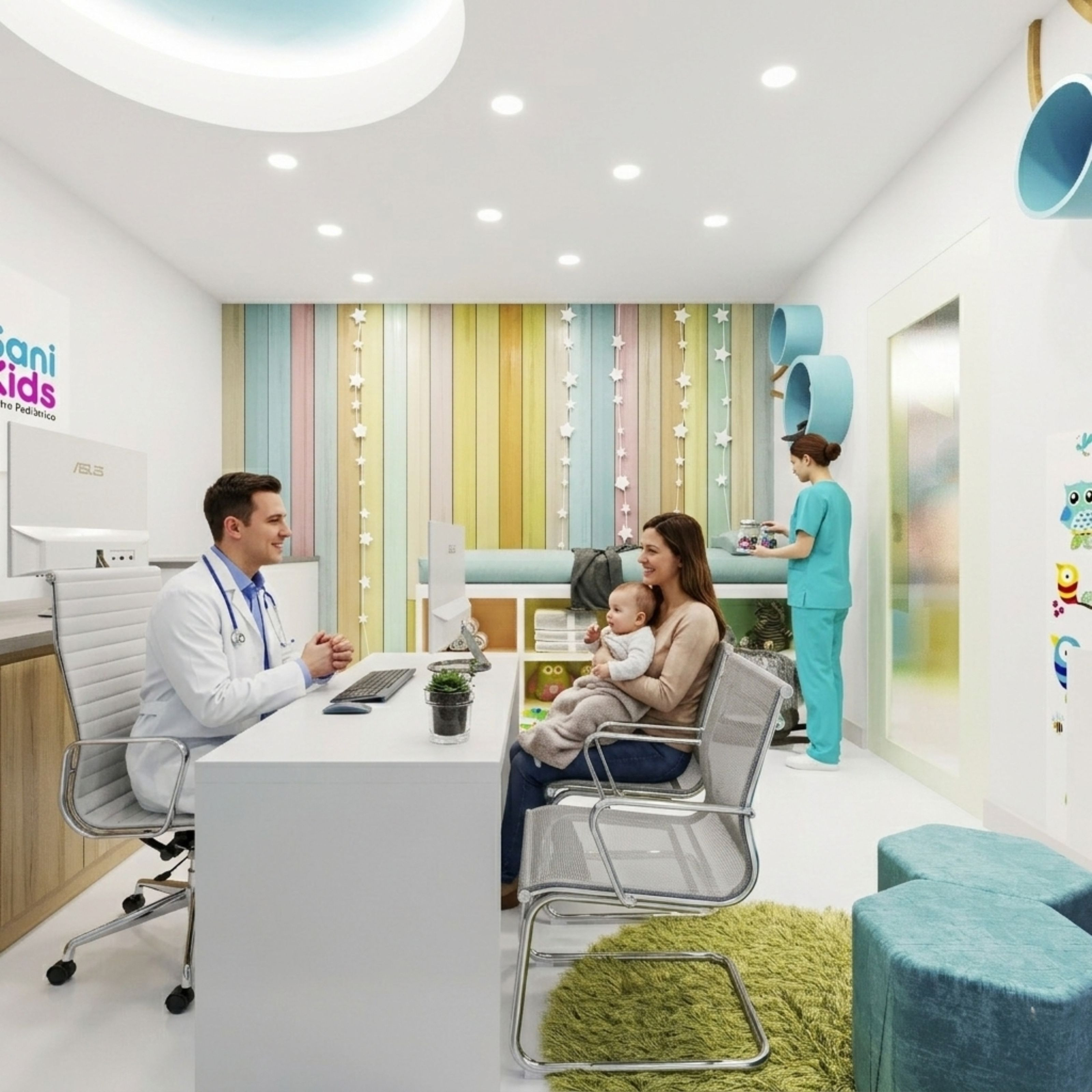 - Diseño interior personalizado: desarrollado por ARAM Arquitectos en las áreas pediátricas y zonas de espera
